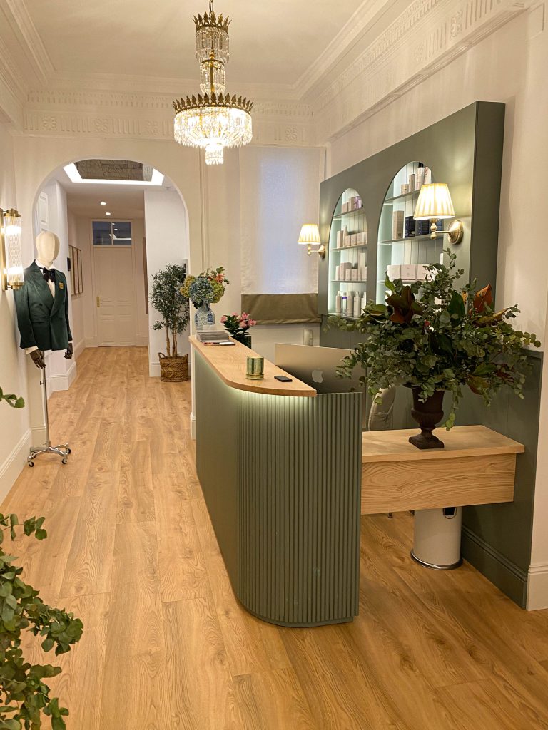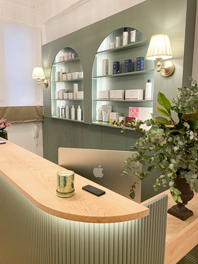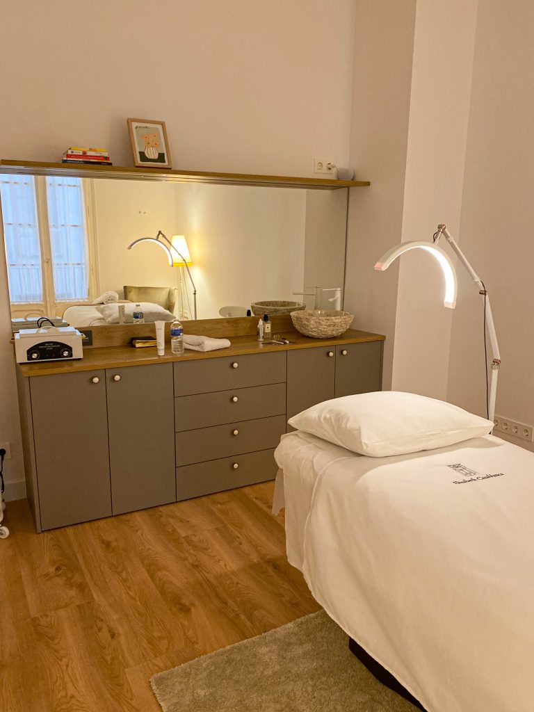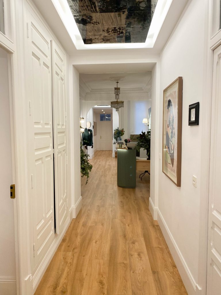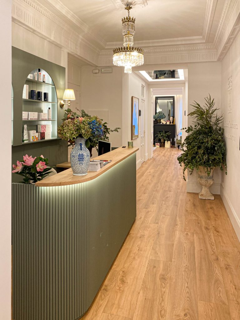 Este proyecto de interiorismo ha supuesto la transformación de una elegante vivienda de uso comercial de techos altos y molduras originales en un sofisticado centro de estética. La propuesta busca preservar la esencia arquitectónica del espacio, resaltando sus elementos clásicos mientras se incorporan muebles contemporáneos y piezas de anticuario que aportan carácter y exclusividad.