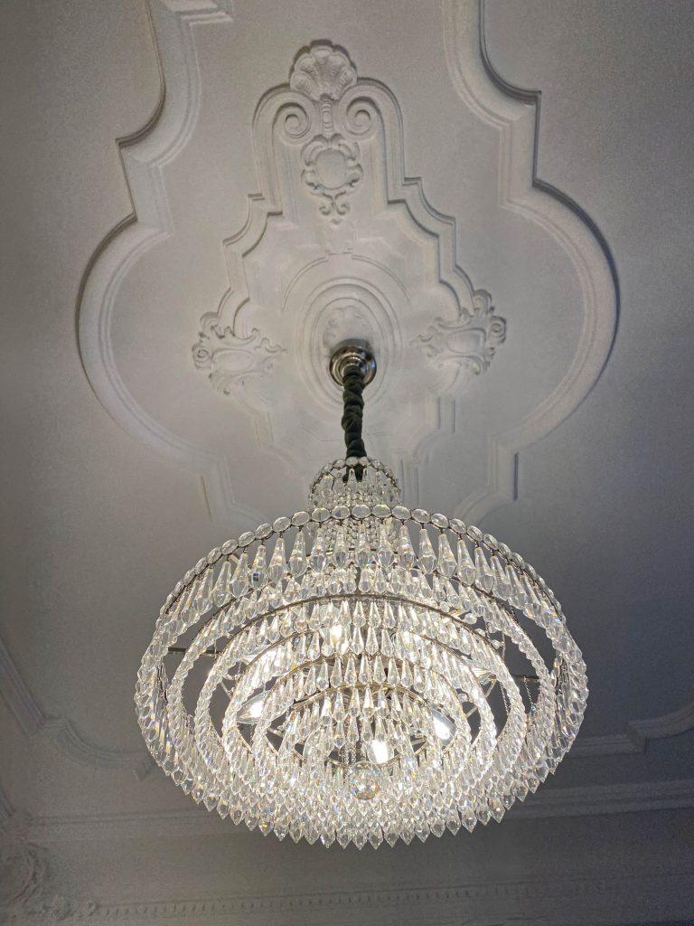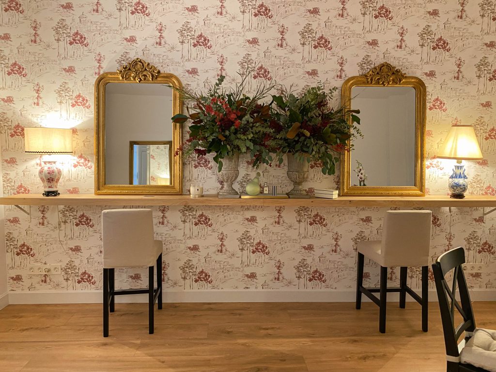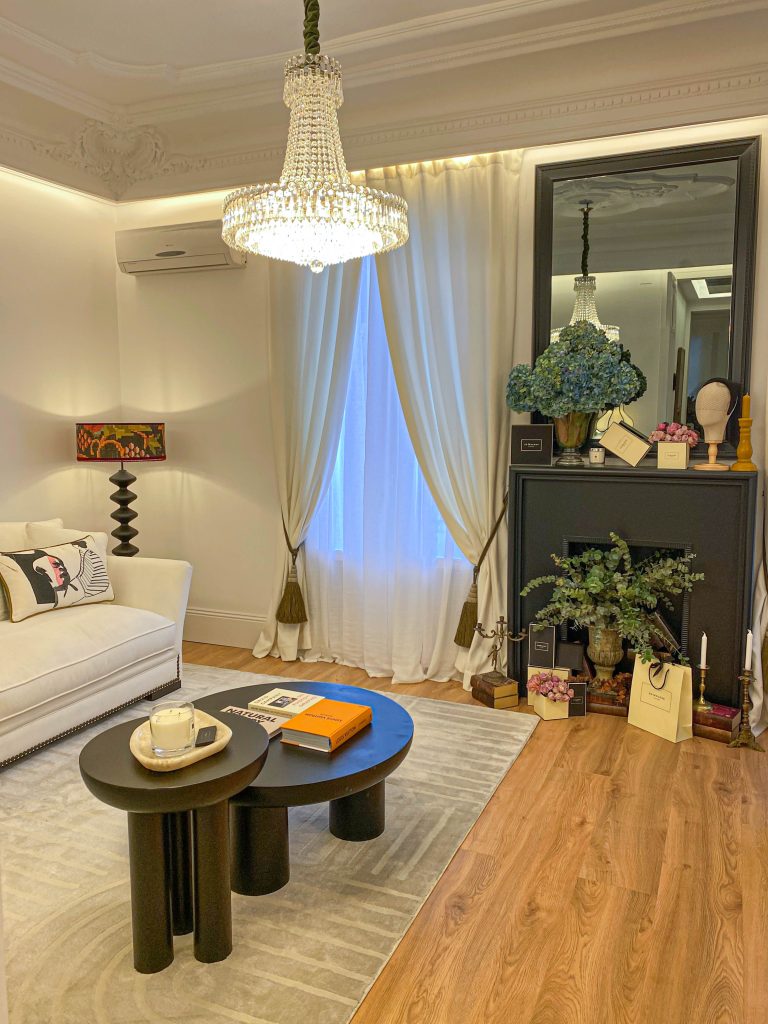 El diseño se basa en un equilibrio entre pasado y presente, donde la majestuosidad de los techos altos con molduras ornamentales se combina con una selección cuidadosa de mobiliario moderno de líneas limpias y piezas antiguas restauradas, creando una atmósfera única y acogedora.