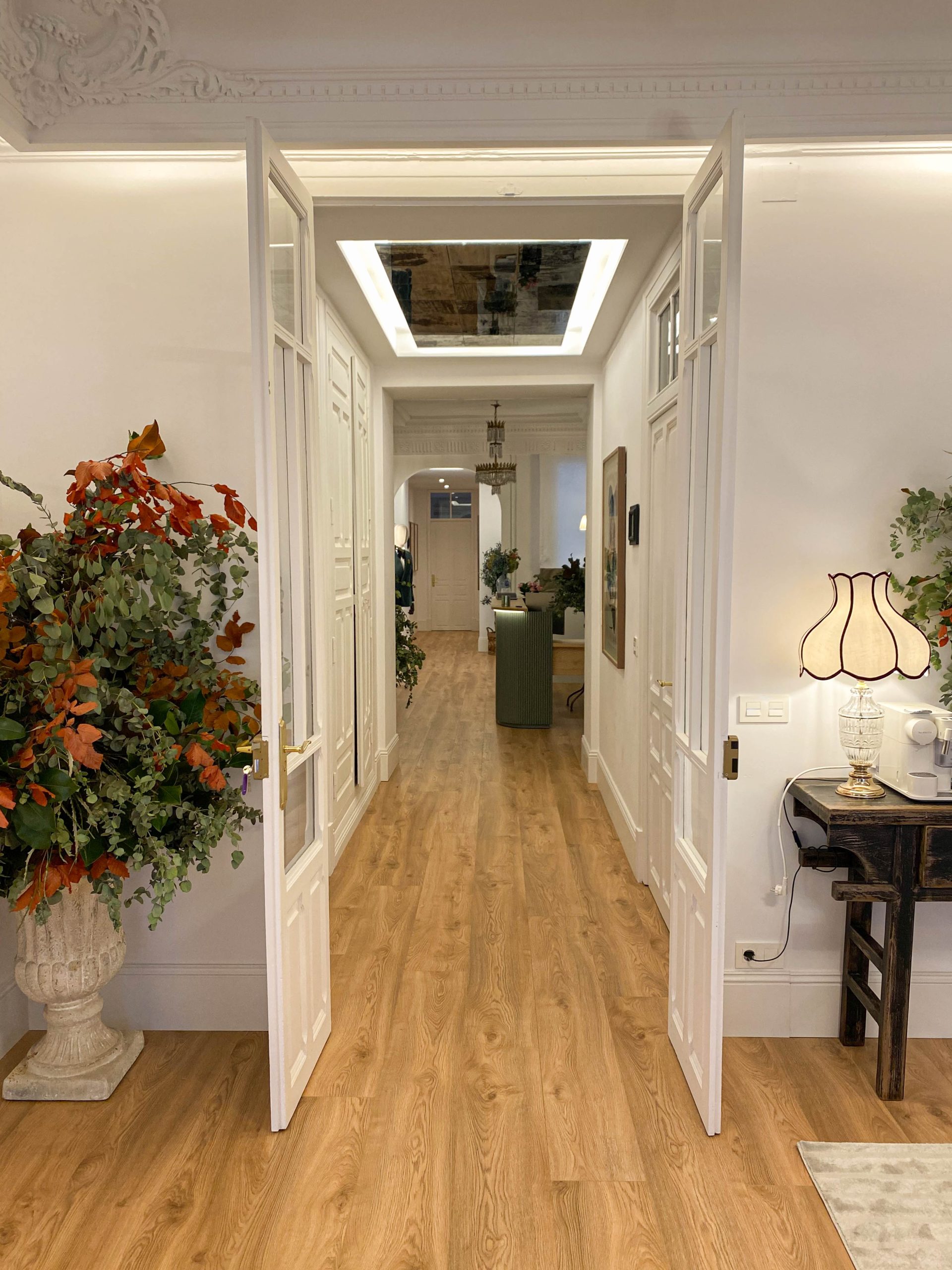 Este proyecto de interiorismo ha supuesto la transformación de una elegante vivienda de uso comercial de techos altos y molduras originales en un sofisticado centro de estética. La propuesta busca preservar la esencia arquitectónica del espacio, resaltando sus elementos clásicos mientras se incorporan muebles contemporáneos y piezas de anticuario que aportan carácter y exclusividad.