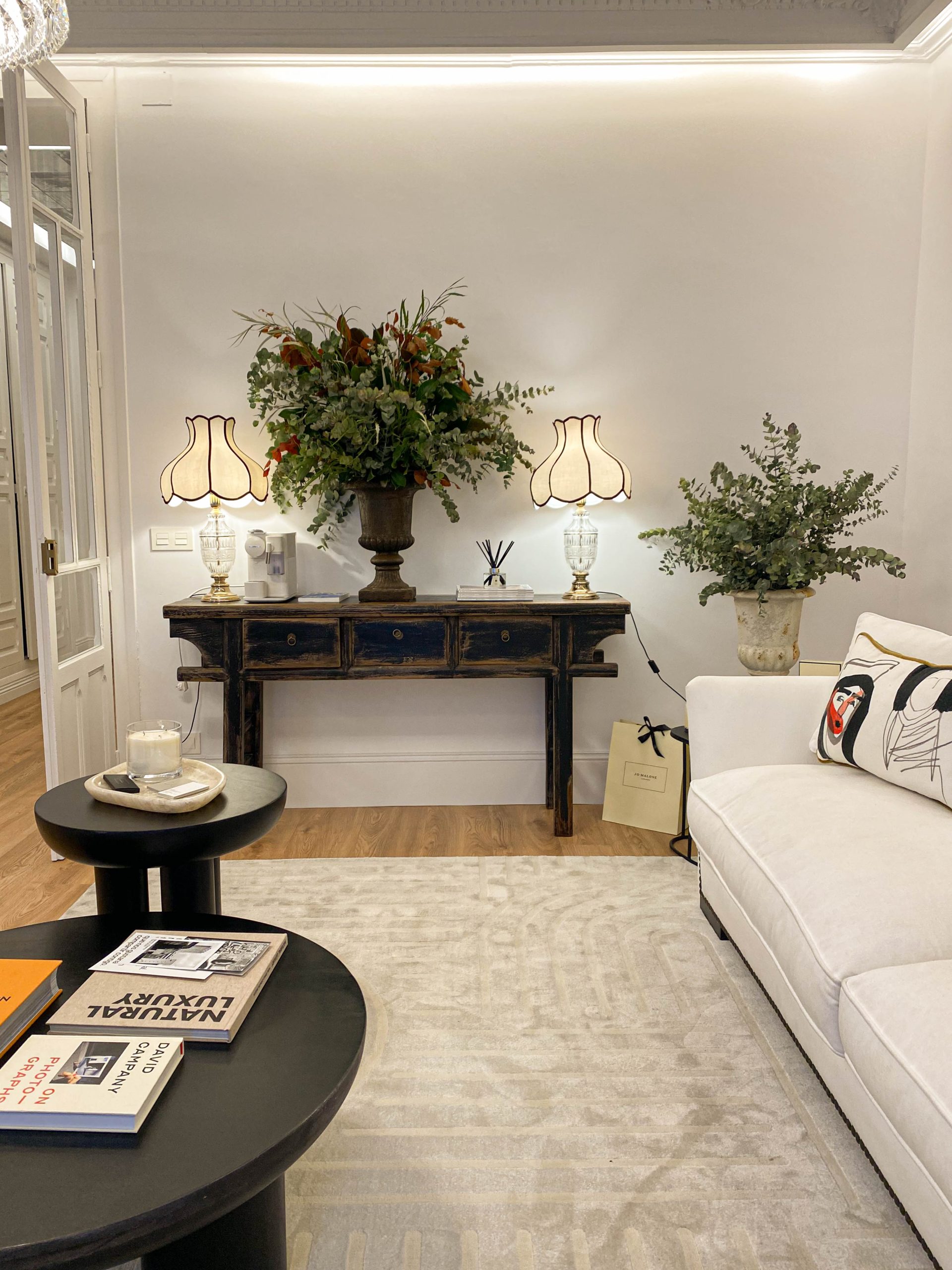 El diseño se basa en un equilibrio entre pasado y presente, donde la majestuosidad de los techos altos con molduras ornamentales se combina con una selección cuidadosa de mobiliario moderno de líneas limpias y piezas antiguas restauradas, creando una atmósfera única y acogedora.