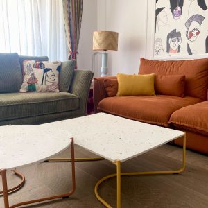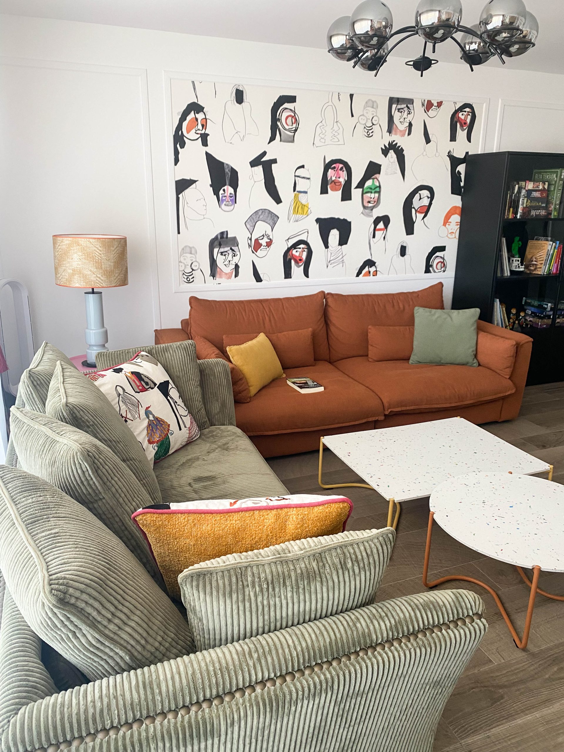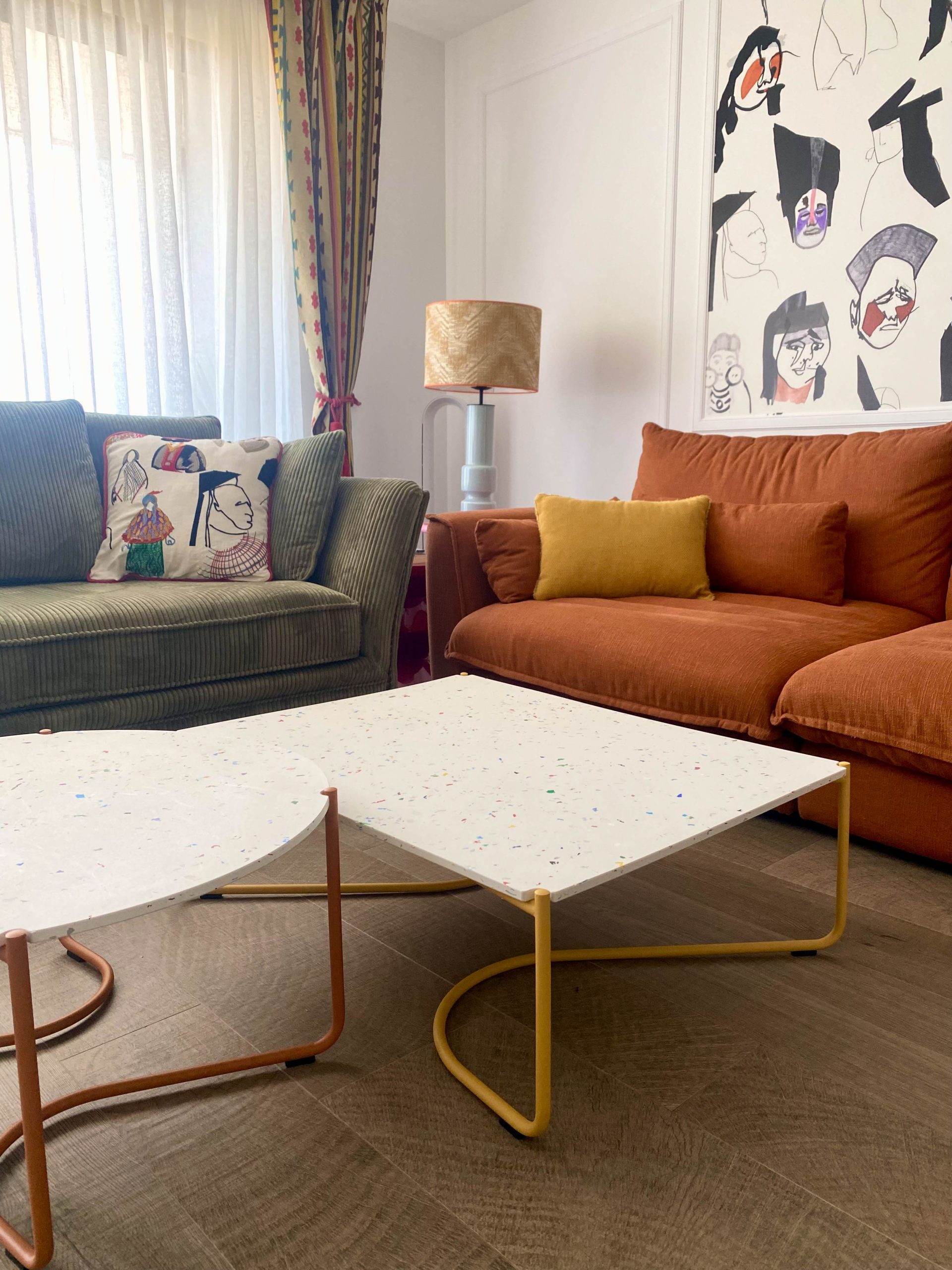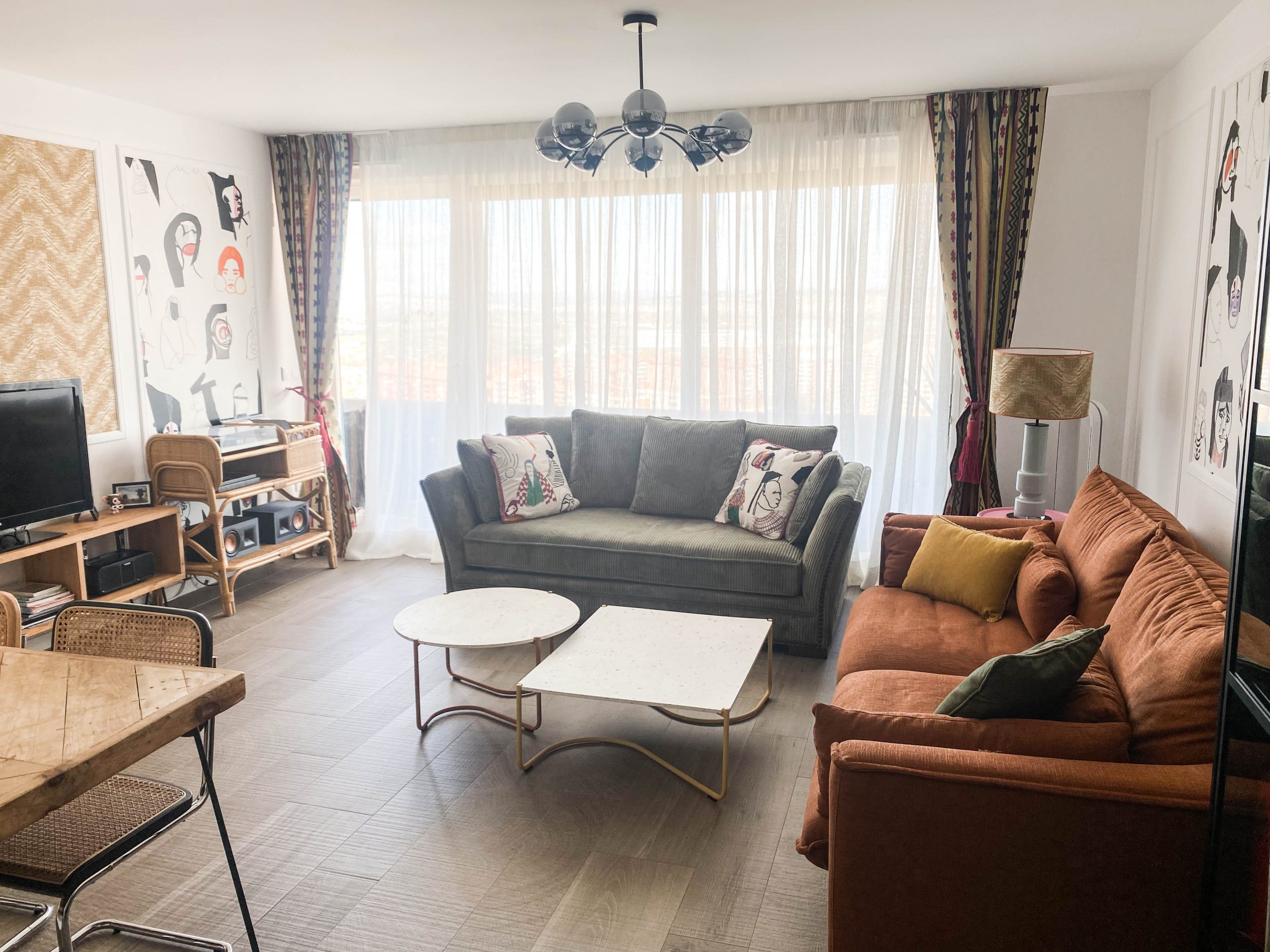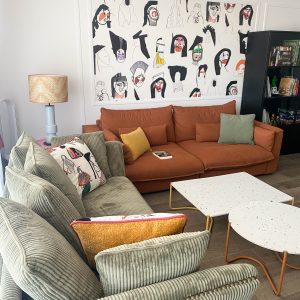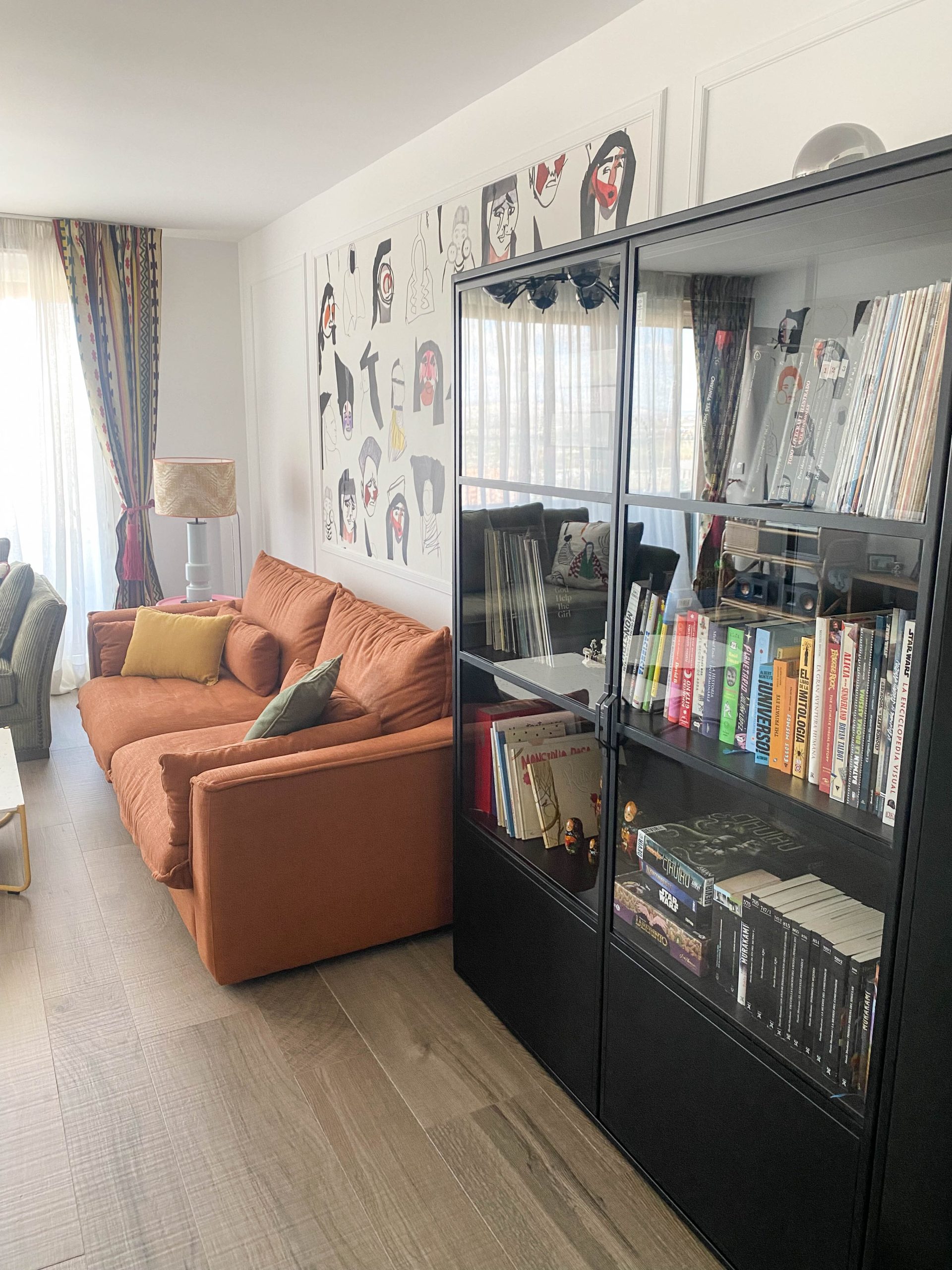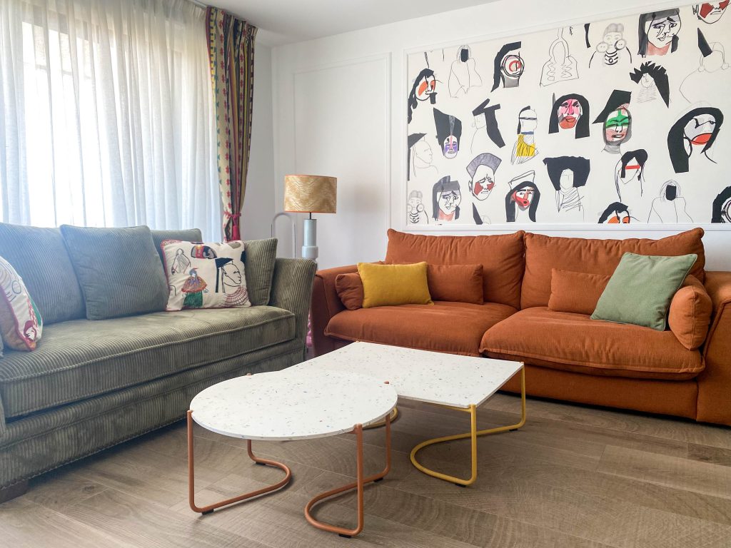 Como eje y protagonista principal está el revestimiento mural de @lamaisonpierrefrey. Donde a través de diferentes tejidos y papeles de la misma firma hemos conseguido el diseño de este espacio. Incluyendo molduras de ORAC DECOR , mesas de centro realizadas en PET imitación al terrazo realizadas por ONDARRETA un gran ventanal con un visillo custodiado dos grandes caídas de tejido bordado tambien de PIERRE FREY con borlones. Gran vitrina en hierro con cristaleras de DAREELS, luminaria de sobremesa en cerámica de AROMAS DEL CAMPO y tulipa a medida a conjunto con el papel. Los sofás, el sofá terracota ya estaba en la vivienda y nosotras propuesimos uno de de NOBLE CREACIONES en pana verde, que además de ser bonito y original se convierte en cama, le hemos aportado vida con diferentes con cojines personalizados, para la zona de comedor un banco a medida de tapicero en piel y boucle. Un salón al que no le falta detalle y que nos encanta.