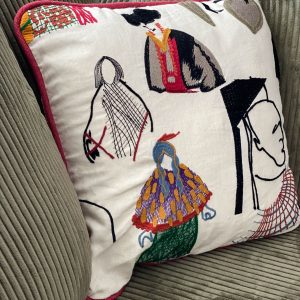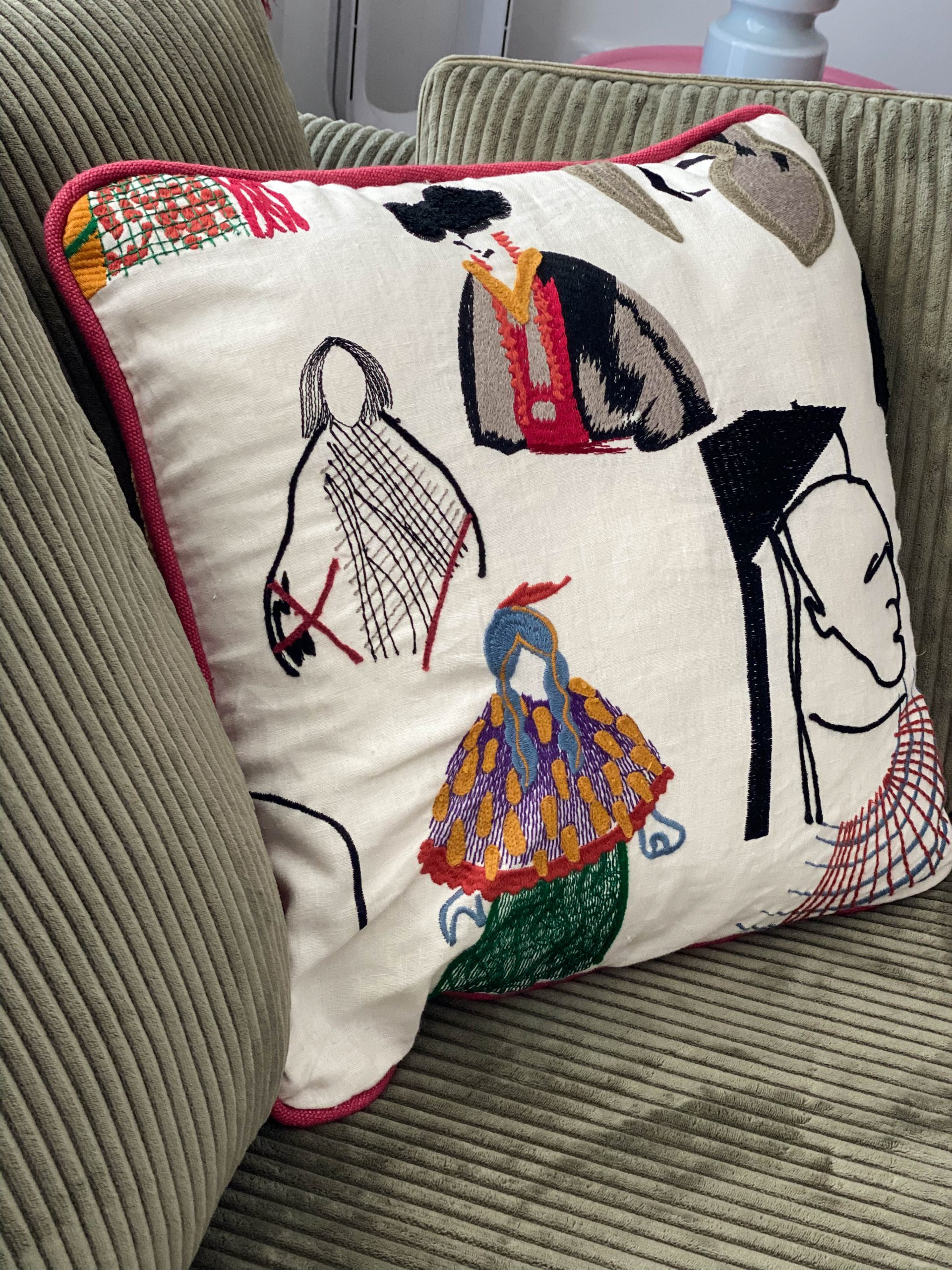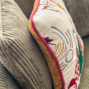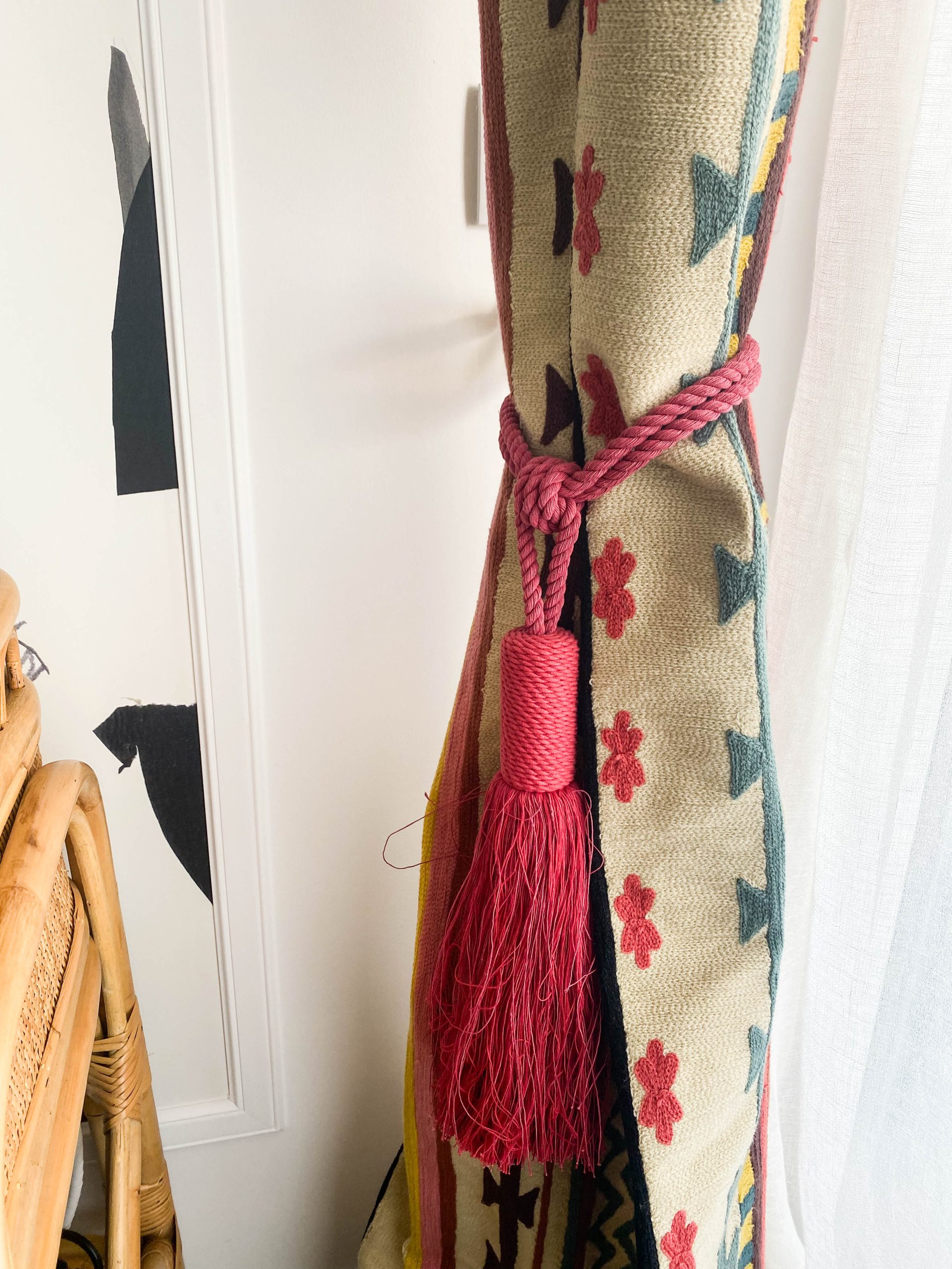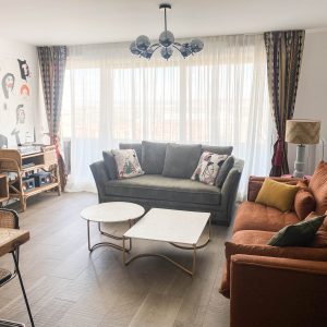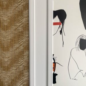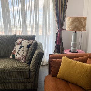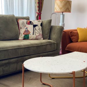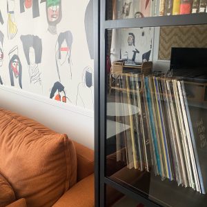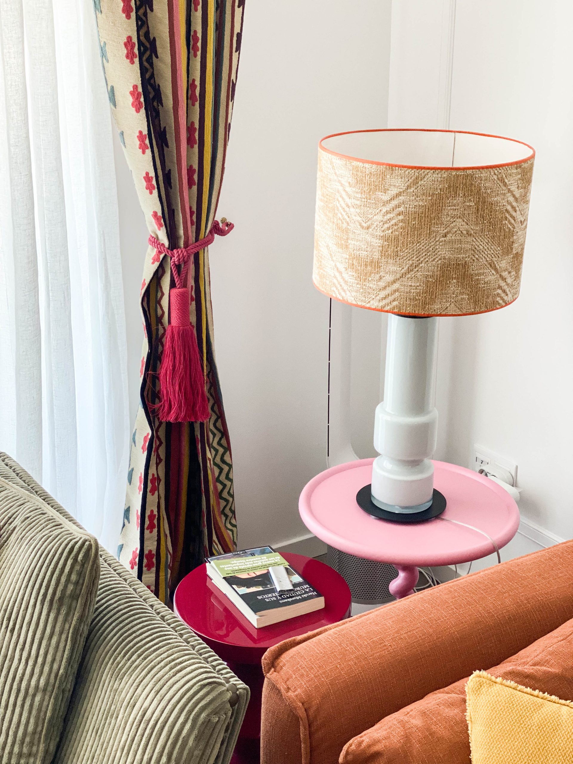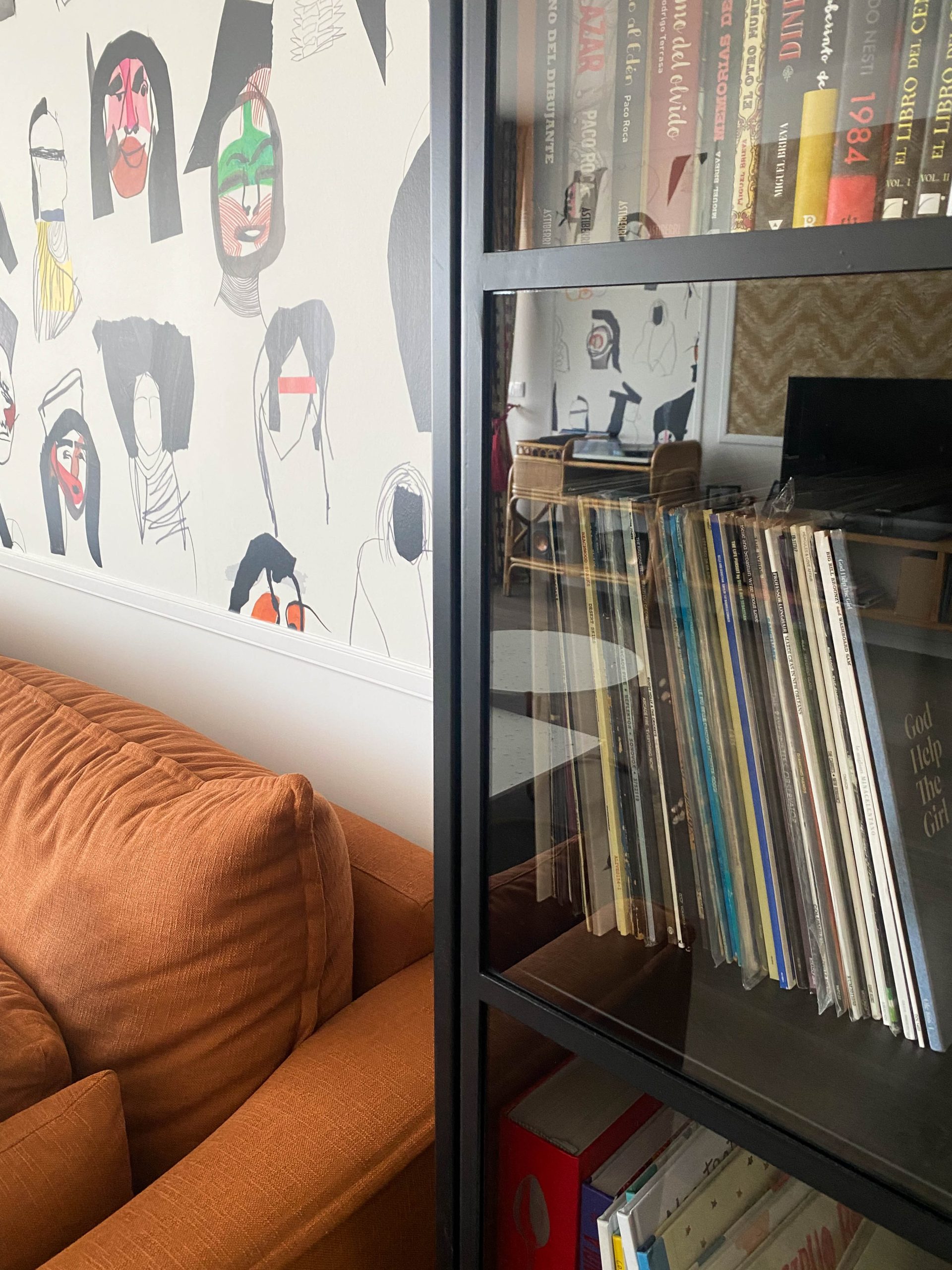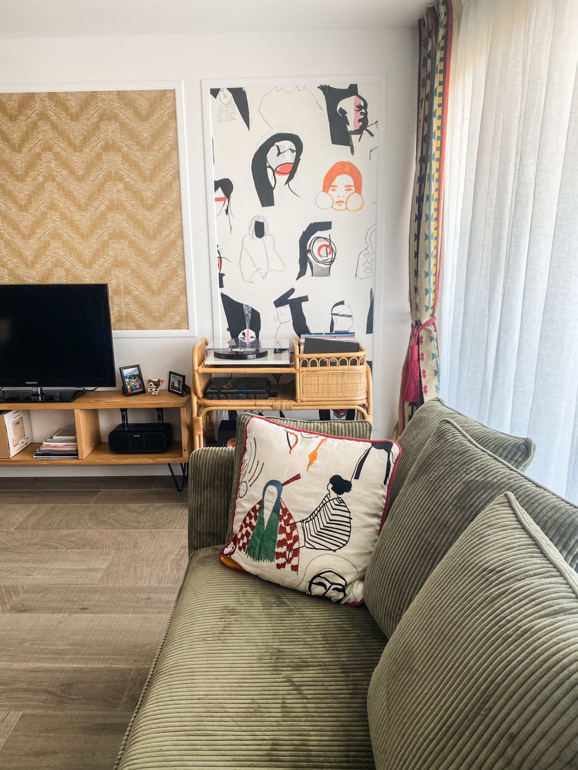 Como eje y protagonista principal está el revestimiento mural de @lamaisonpierrefrey. Donde a través de diferentes tejidos y papeles de la misma firma hemos conseguido el diseño de este espacio. Incluyendo molduras de ORAC DECOR , mesas de centro realizadas en PET imitación al terrazo realizadas por ONDARRETA un gran ventanal con un visillo custodiado dos grandes caídas de tejido bordado tambien de PIERRE FREY con borlones. Gran vitrina en hierro con cristaleras de DAREELS, luminaria de sobremesa en cerámica de AROMAS DEL CAMPO y tulipa a medida a conjunto con el papel. Los sofás, el sofá terracota ya estaba en la vivienda y nosotras propuesimos uno de de NOBLE CREACIONES en pana verde, que además de ser bonito y original se convierte en cama, le hemos aportado vida con diferentes con cojines personalizados, para la zona de comedor un banco a medida de tapicero en piel y boucle. Un salón al que no le falta detalle y que nos encanta.