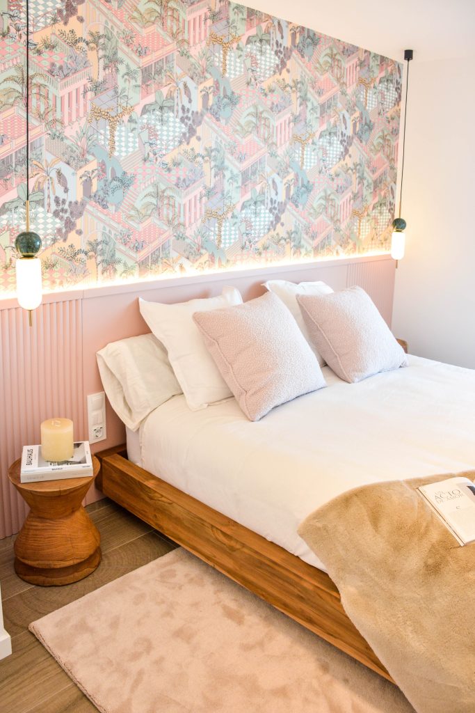 Interiorismo para un dormitorio muy especial. La premisa era buscar algo diferente, atemporal y ecléctico. La elección del revestimiento mural como protagonista de la estancia de @cole_and_son_wallpapers junto con el diseño de los demás elementos, como por ejemplo el cabecero retroilumando elaborado a medida lacado con molduras de @oracdecor_spain crean una atmósfera cálida y única. Para la cama y mesillas hemos elegido maderas naturales de @dareels_ para terminar la iluminación decorativa de @aromasdelcampo y para la iluminación más tecnico hemos optado por un carril empotrado con puntos de luz y unos focos dirigibles. Para la decoración una alfombra de pelito de KP, unos cojines en bouclé y una manta de pelito en color.
