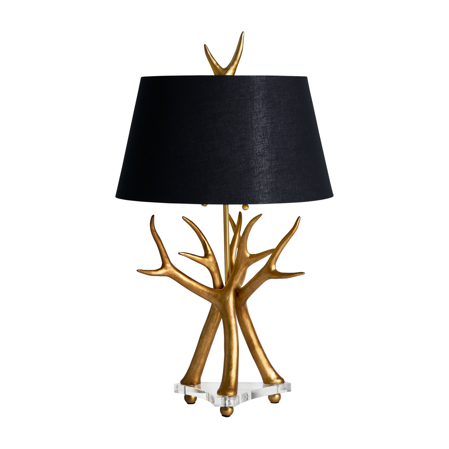 LÁMPARA DE SOBREMESA, EN COLOR NEGRO/ORO, DE ESTILO ART DECO. FABRICADO EN RESINA, COMBINADO CON CRISTAL Y ALGODÓN. PRODUCTO DESMONTABLE.