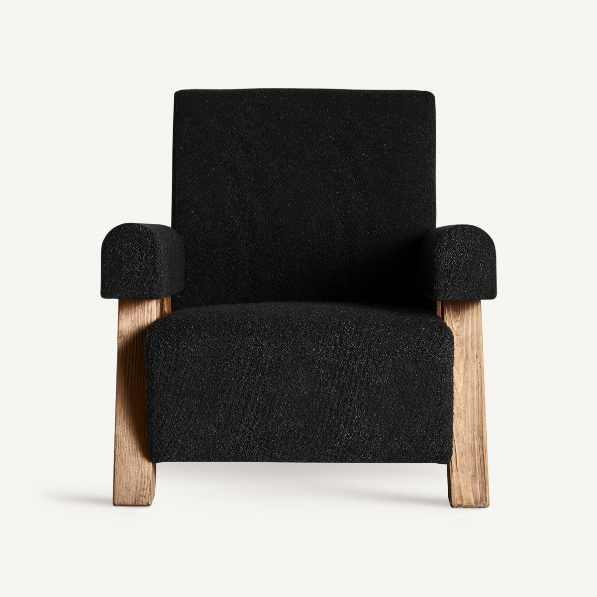 Sillón sully, en color negro/natural, de estilo art deco. Fabricado en madera de pino reciclado, combinado con poliéster.
