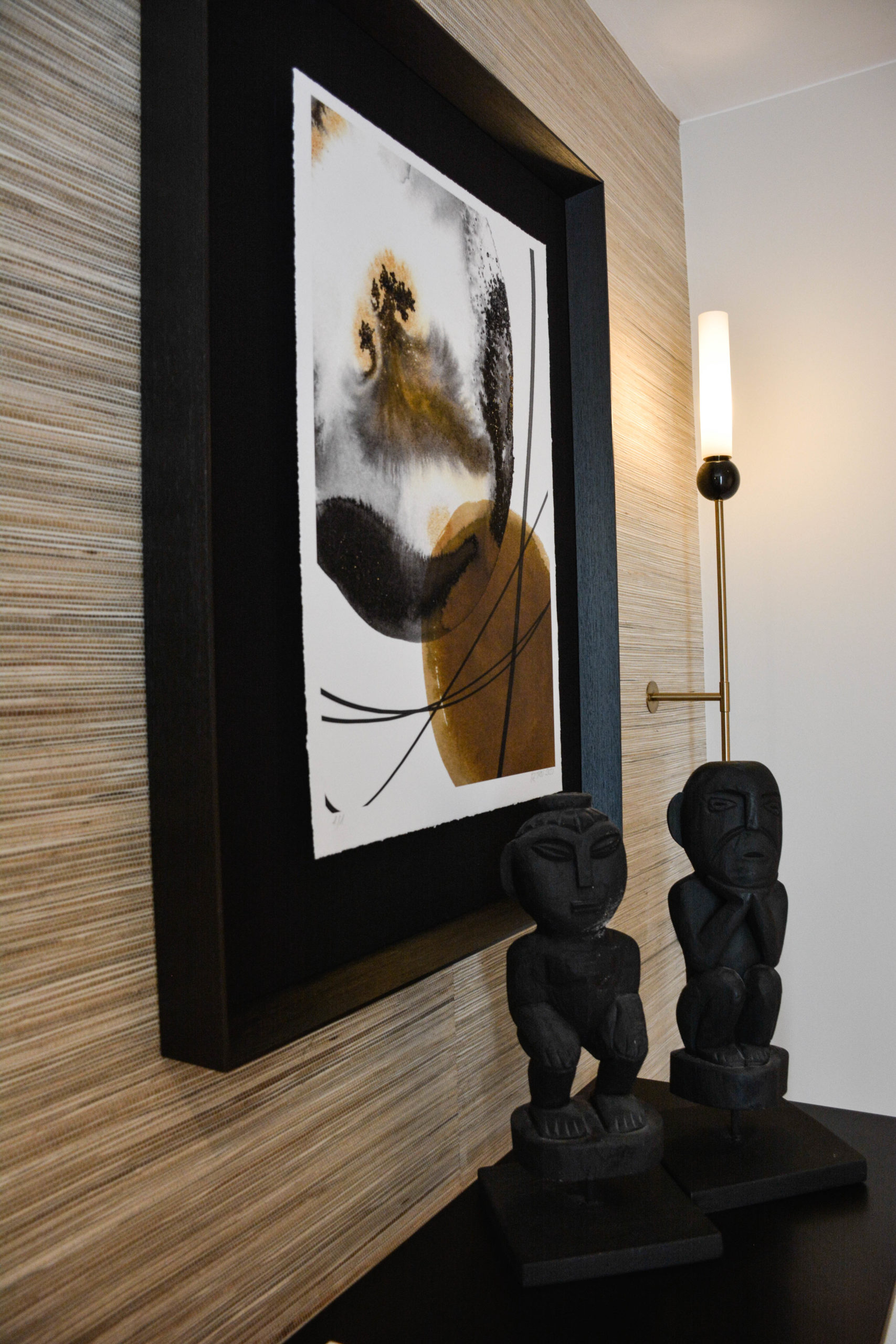 Desliza para ver el antes y después. Os mostramos distintos puntos de vistas de un mismo rincón y cómo cambiar la decoración puede modificar completamente un espacio. La entrada se dividía en dos por un tabique el cual se derribó para ganar amplitud y luz. Para la decoración cabe destacar el papel de fibras naturales, combinado con el mobiliario y la decoración en colores negros. Las joyas del espacio son los dos cuadros de diseño de autor @vrossdesign enmarcados al aire, custodiados por dos preciosos apliques de pared.