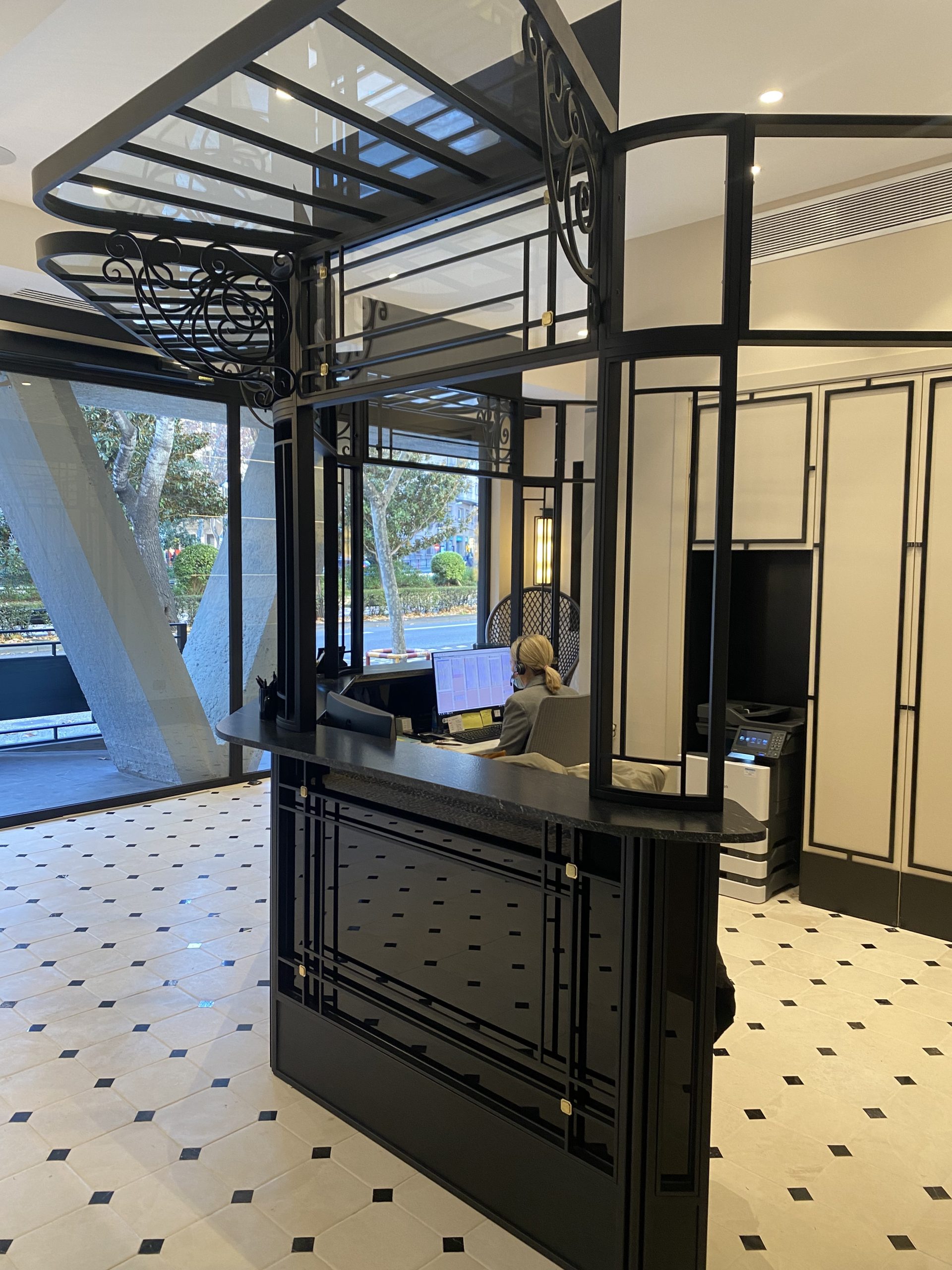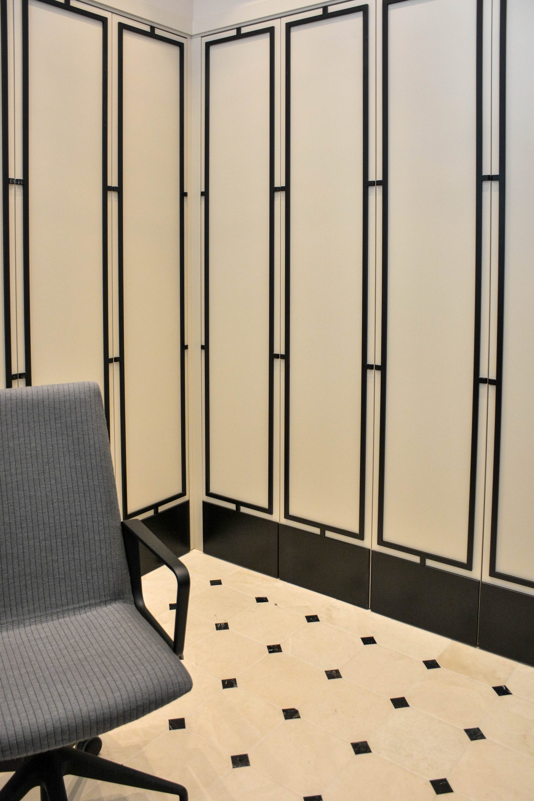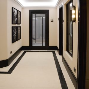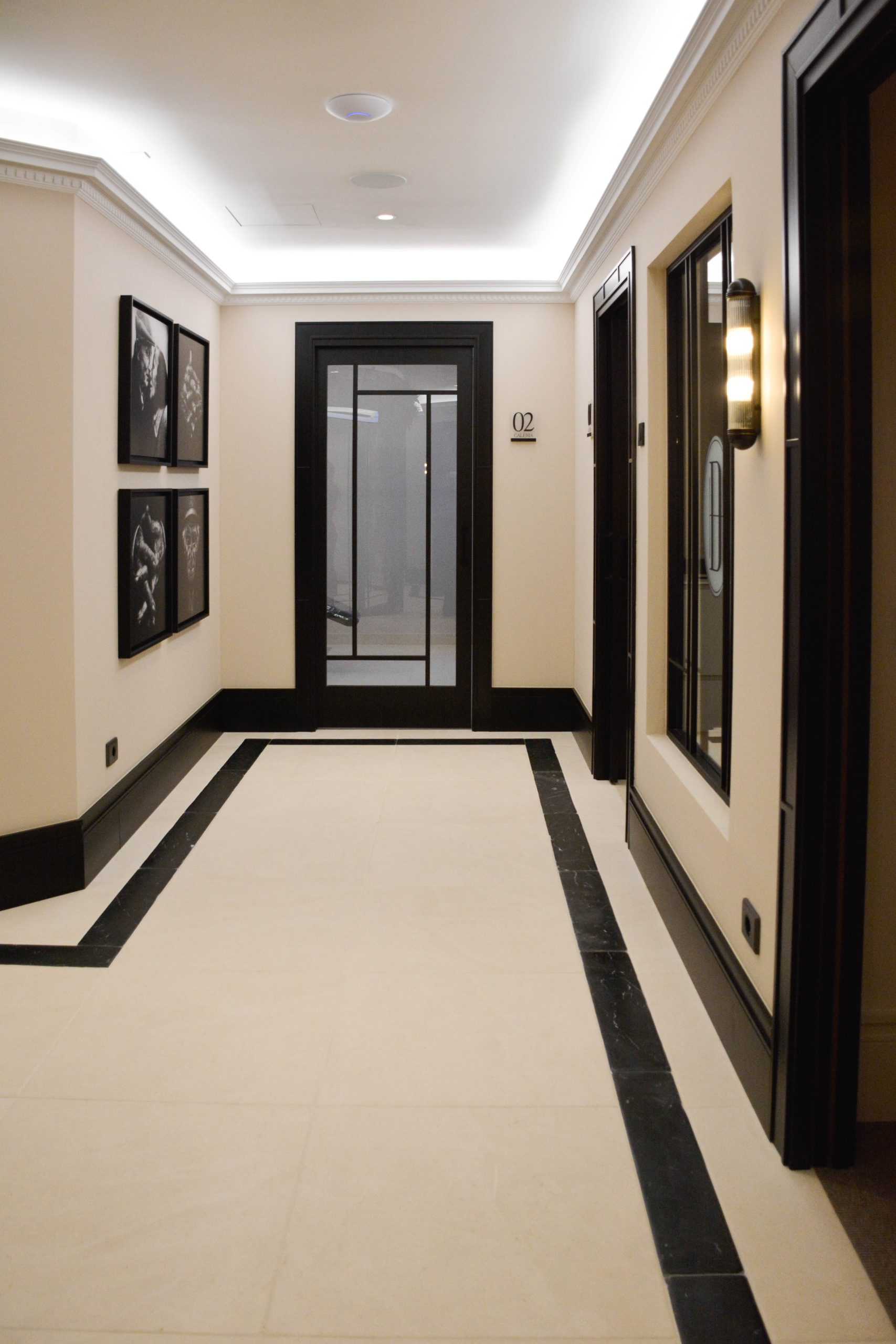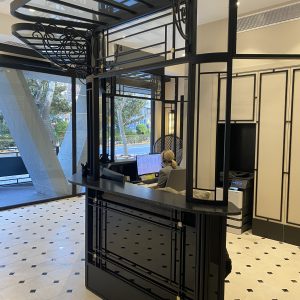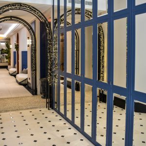 La recepción descansa sobre un suelo de caliza y mármol. El gran mueble de recepción elaborado en hierro, mármol y vidrio hace que sea el protagonista del espacio. A su derecha un lineal de armarios a medida a cuarterones con espejos.