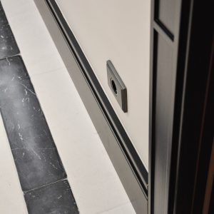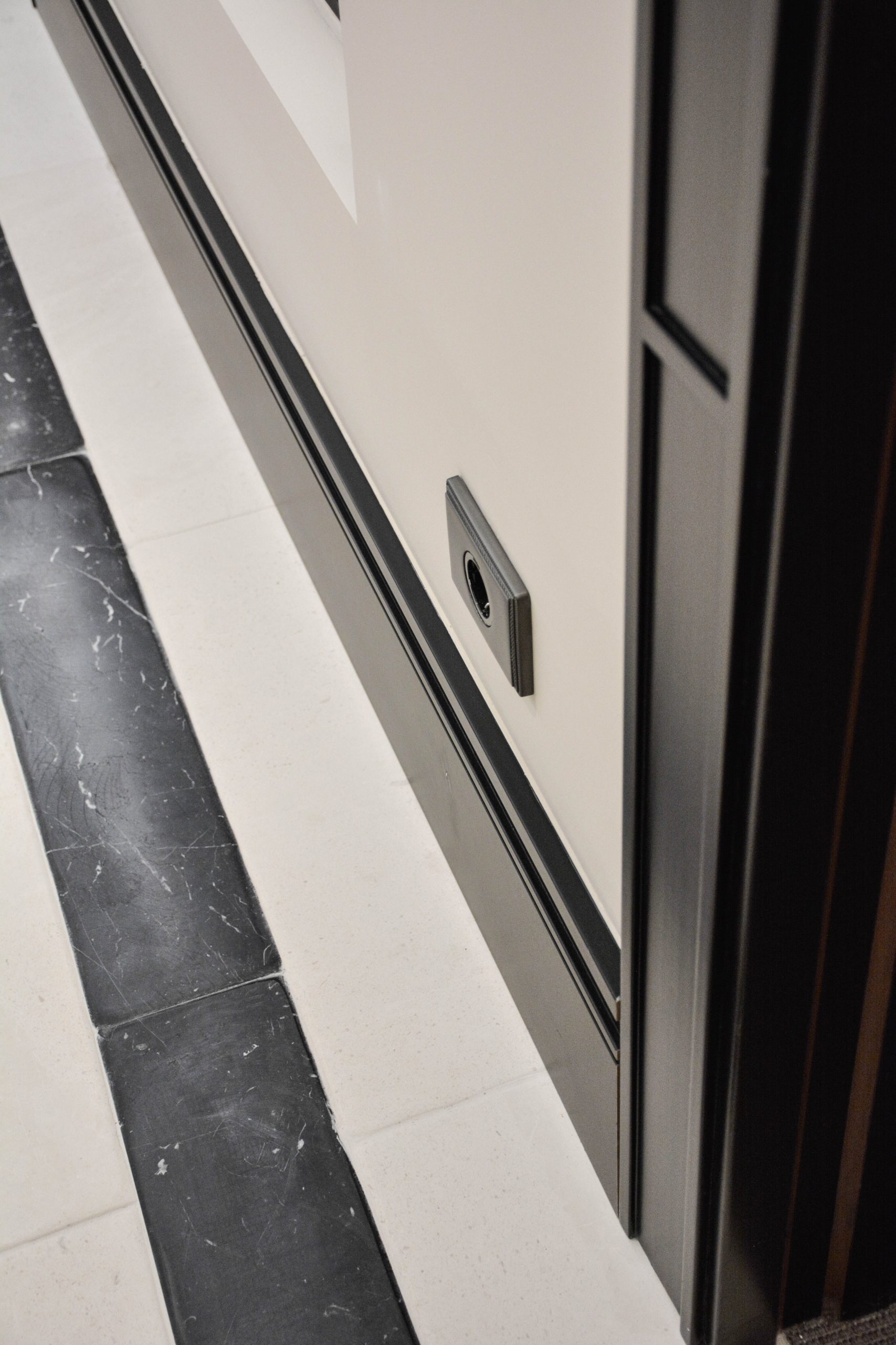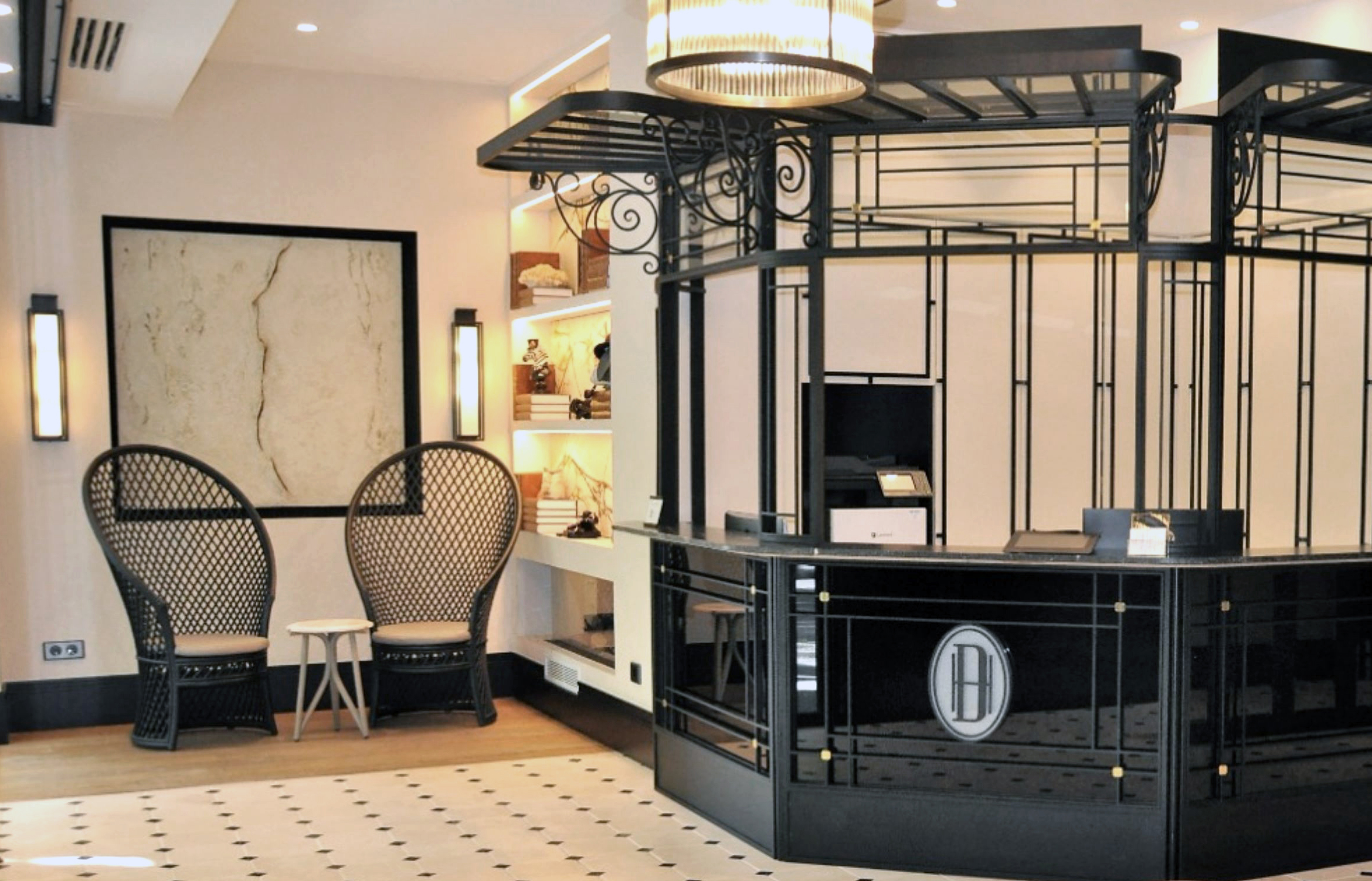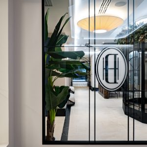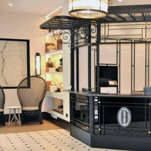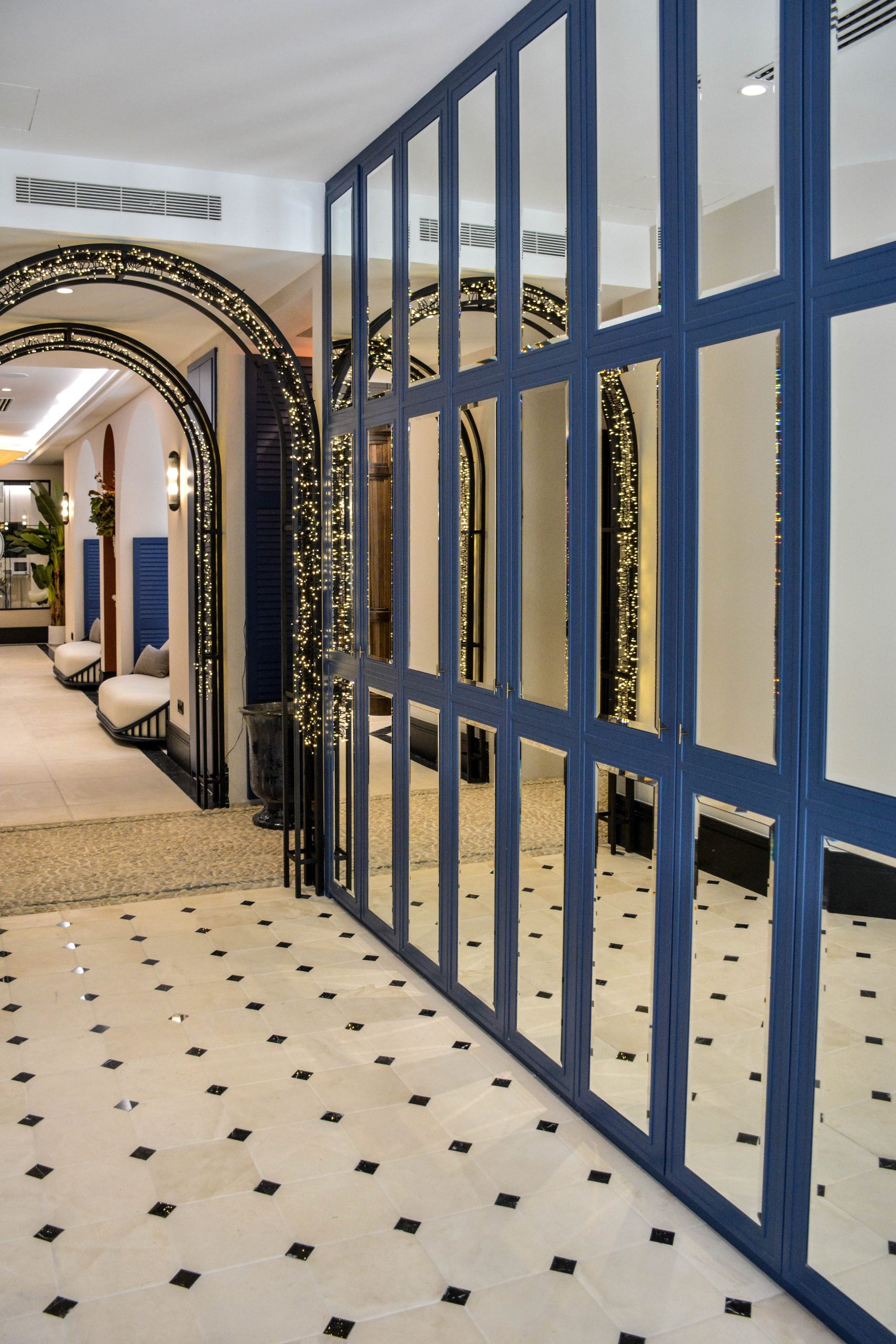 La recepción descansa sobre un suelo de caliza y mármol. El gran mueble de recepción elaborado en hierro, mármol y vidrio hace que sea el protagonista del espacio. A su derecha un lineal de armarios a medida a cuarterones con espejos.