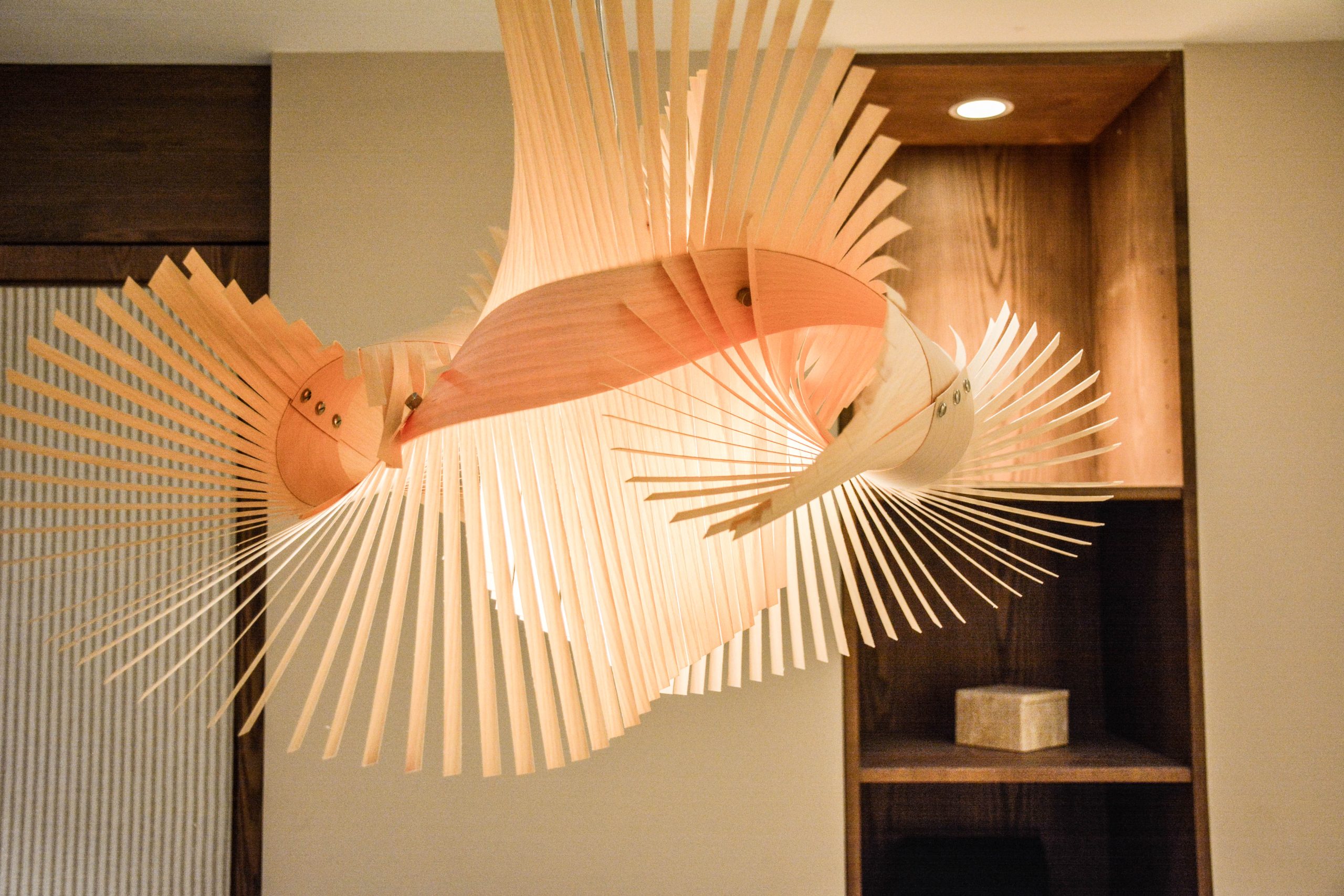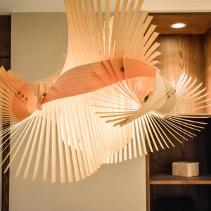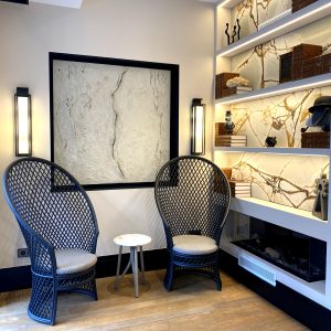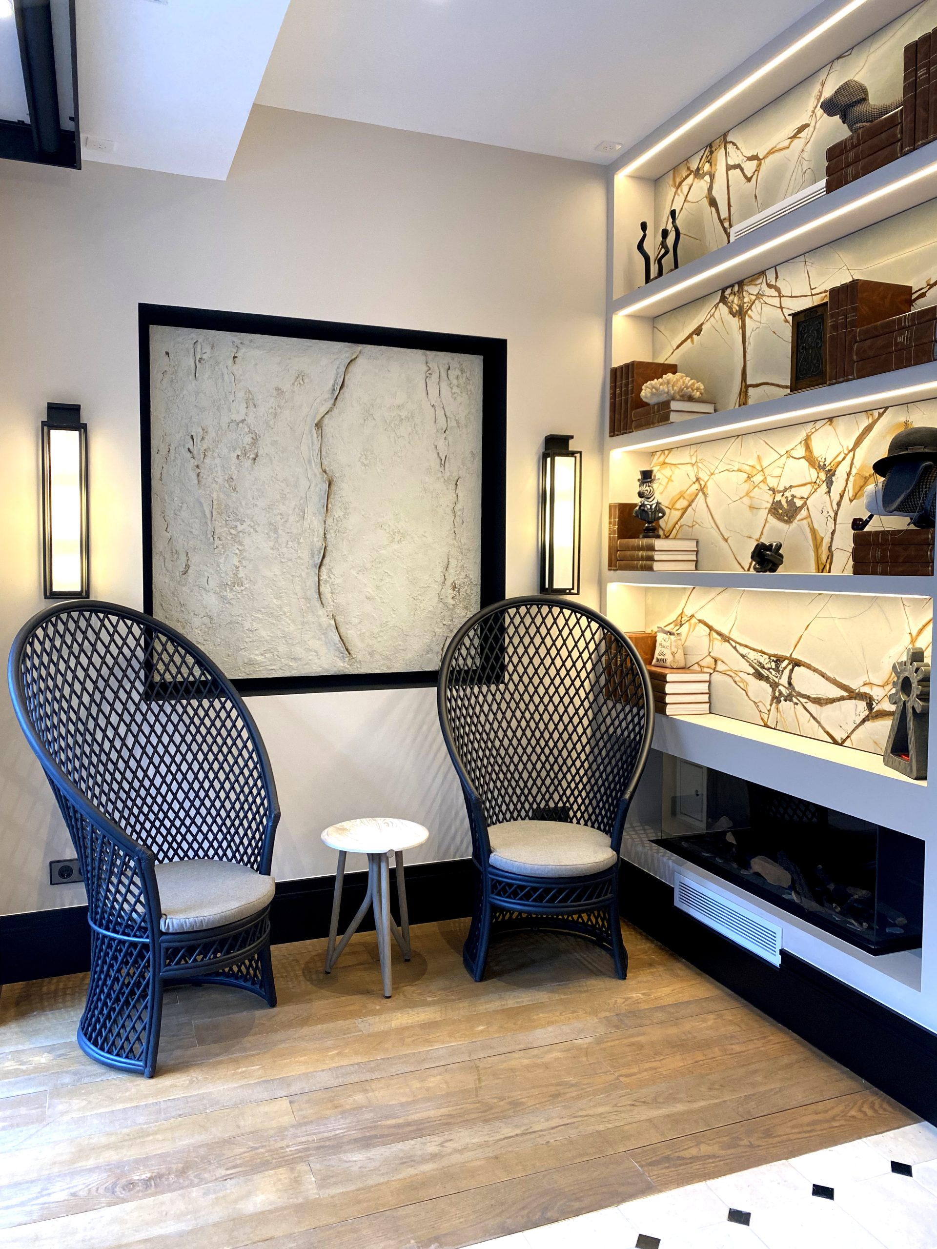 En el hall principal, una zona de espera con un cuadro de María Ciria que custodia ese espacio y a su vez una estantería revestida con una piedra retroiluminada. El suelo es un roble natural colocado en diferentes formas.