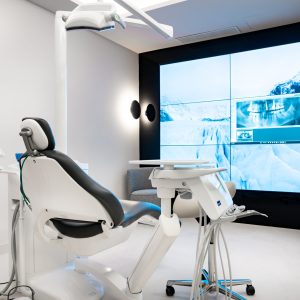 Respecto a los gabinetes de odontología se ha optado por un espacio en tonos neutros, blancos, y muy pulidos, con techos retroiluminados y pantallas integradas.
