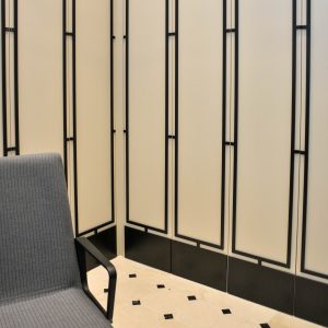 También, una zona de espera con dos bancos insertados en unos arcos con celosías, todos ellos de Expormin, con tejidos de fácil limpieza para un buen uso.