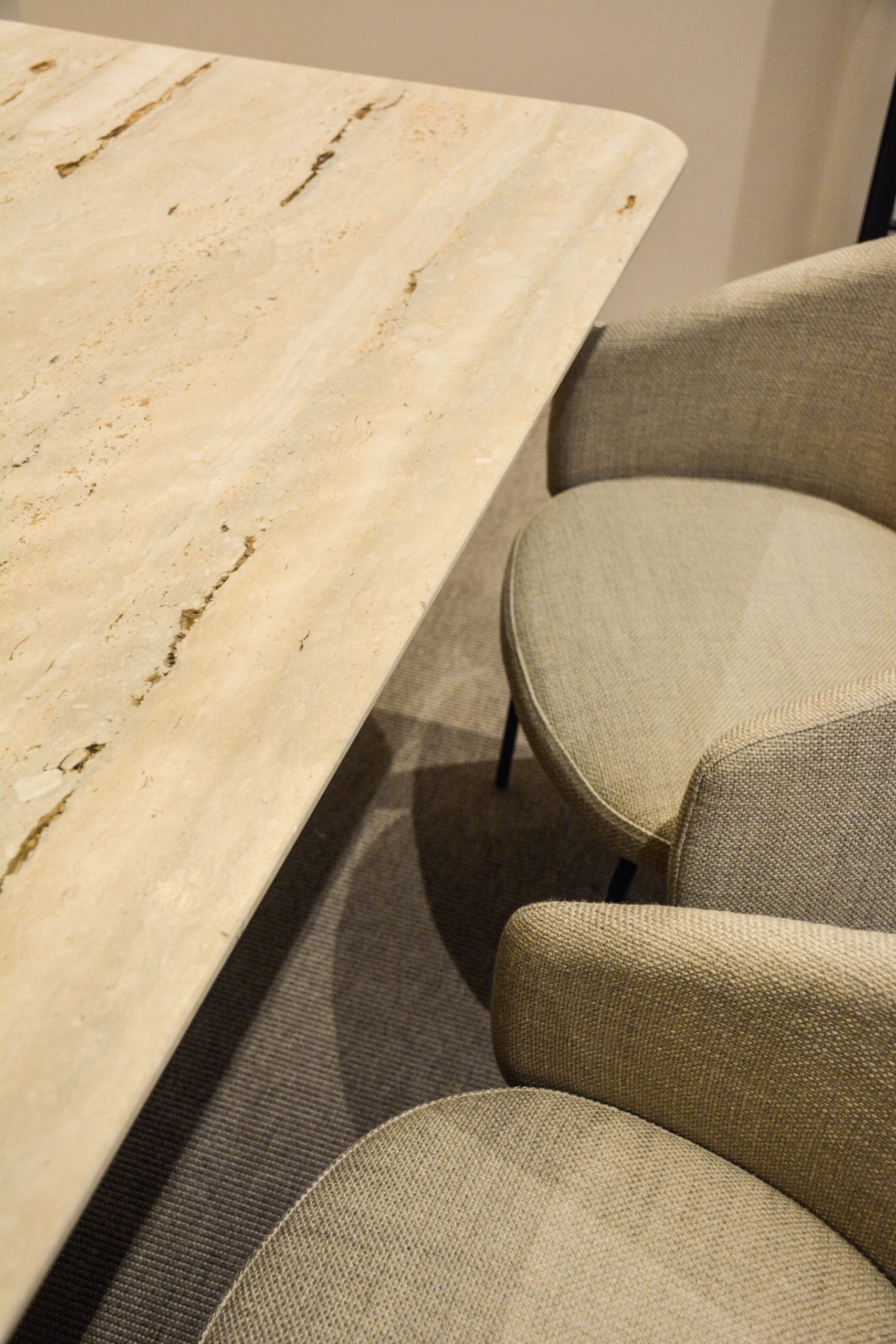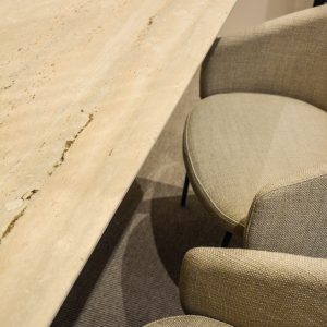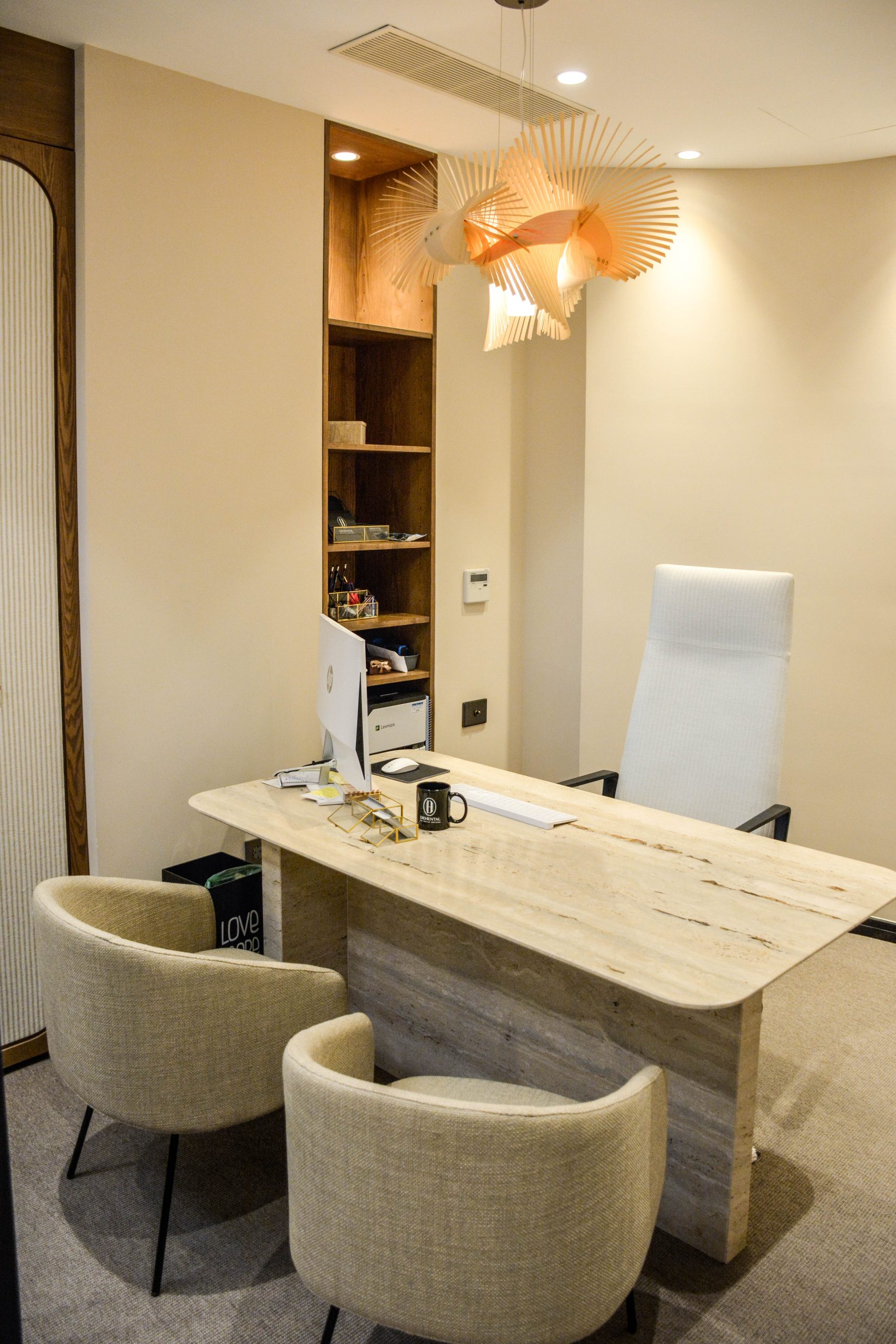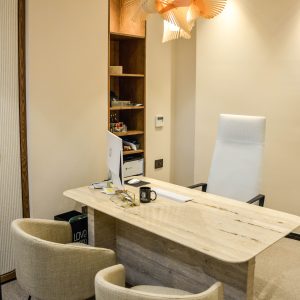 El despacho y la sala de reuniones están enmoquetados y los dos constan de un diseño con mobiliario a medida como la mesa de travertino, el armario entelado.. Además de mobiliario de Ondarreta, Bonaldo, Andreu World etc. los dos generan una atmosfera ideal para la atención de sus pacientes.