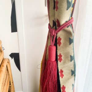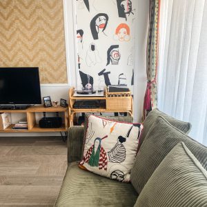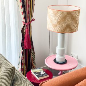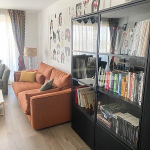 Como eje y protagonista principal está el revestimiento mural de @lamaisonpierrefrey. Donde a través de diferentes tejidos y papeles de la misma firma hemos conseguido el diseño de este espacio. Incluyendo molduras de ORAC DECOR , mesas de centro realizadas en PET imitación al terrazo realizadas por ONDARRETA un gran ventanal con un visillo custodiado dos grandes caídas de tejido bordado tambien de PIERRE FREY con borlones. Gran vitrina en hierro con cristaleras de DAREELS, luminaria de sobremesa en cerámica de AROMAS DEL CAMPO y tulipa a medida a conjunto con el papel. Los sofás, el sofá terracota ya estaba en la vivienda y nosotras propuesimos uno de de NOBLE CREACIONES en pana verde, que además de ser bonito y original se convierte en cama, le hemos aportado vida con diferentes con cojines personalizados, para la zona de comedor un banco a medida de tapicero en piel y boucle. Un salón al que no le falta detalle y que nos encanta.