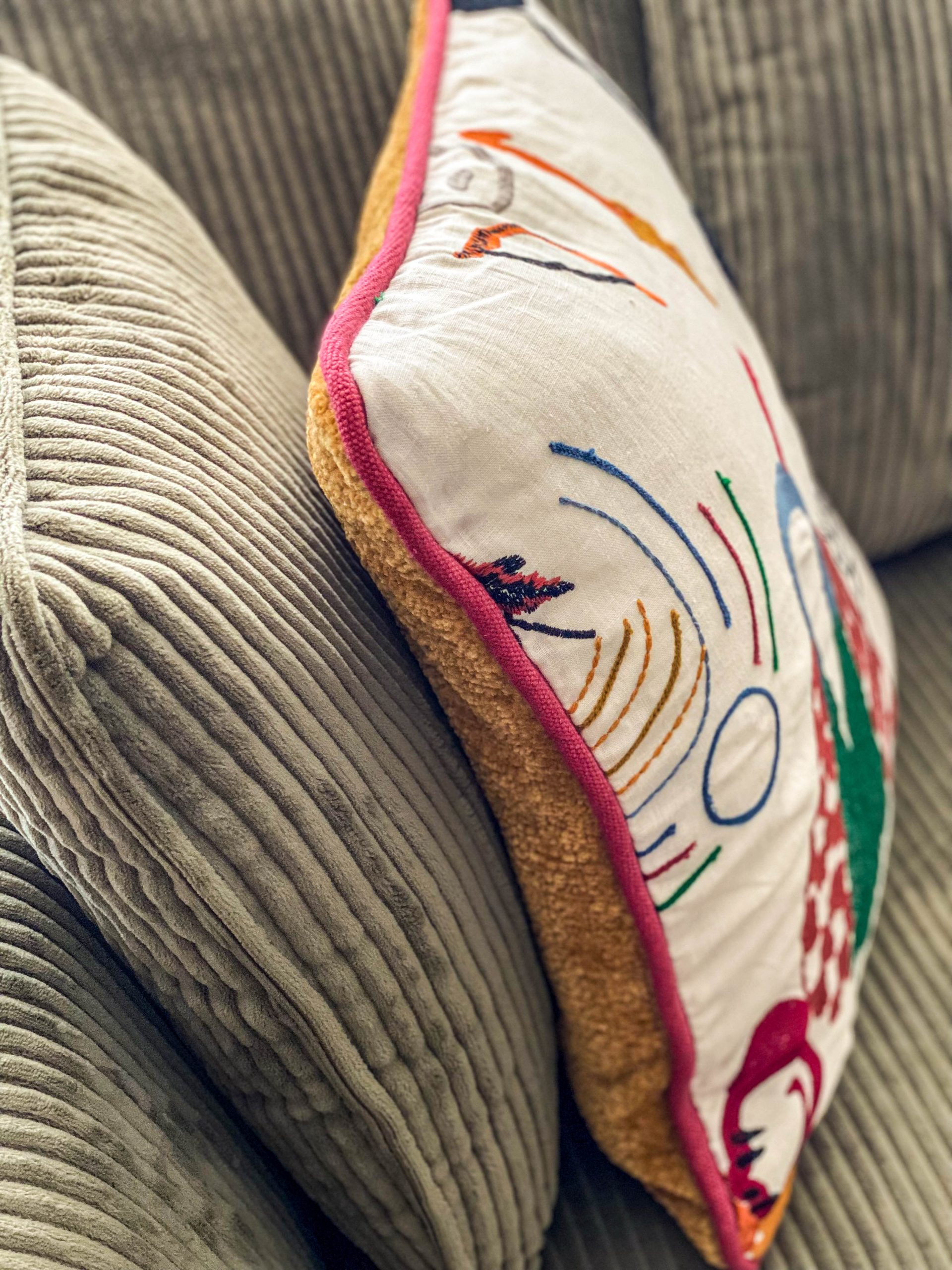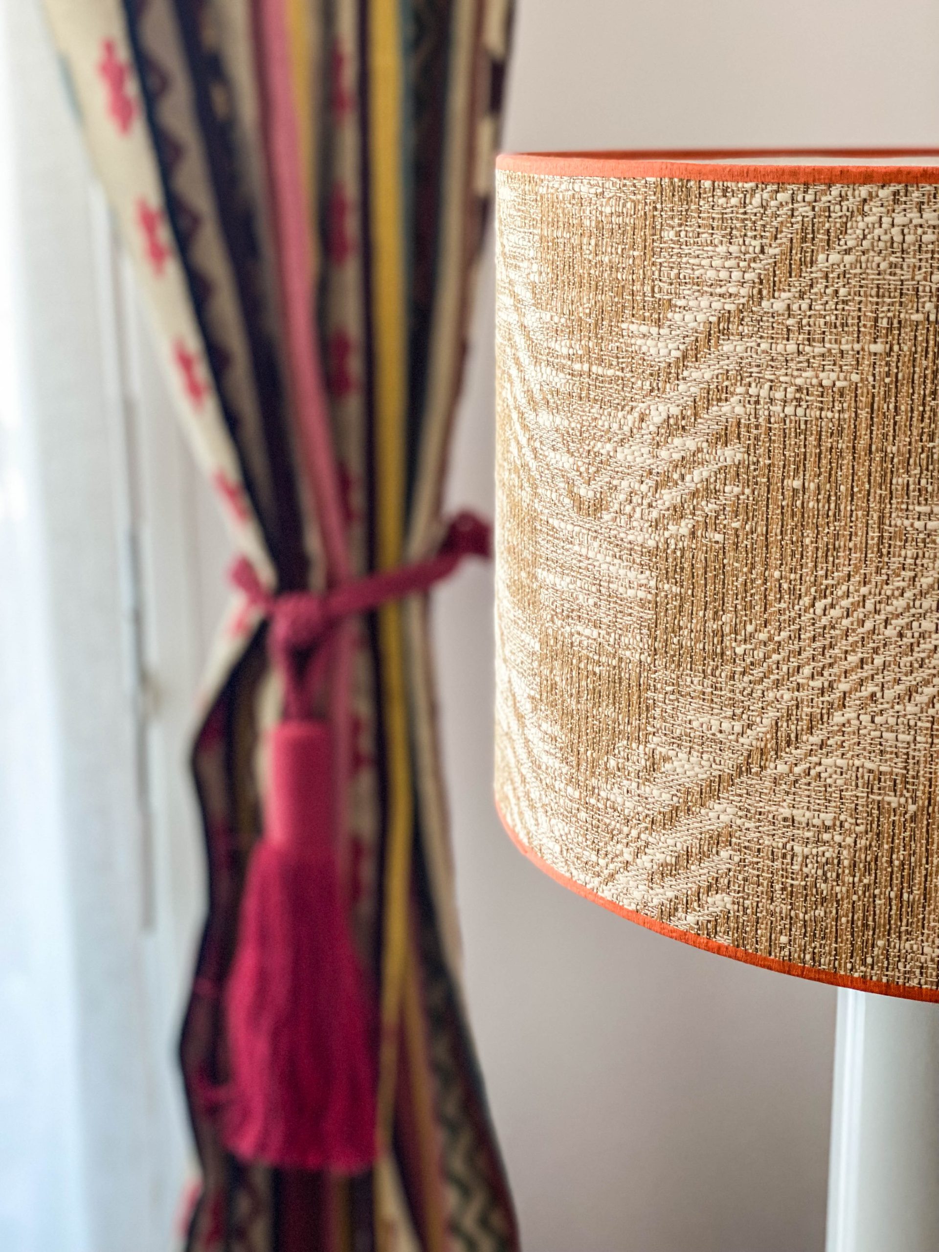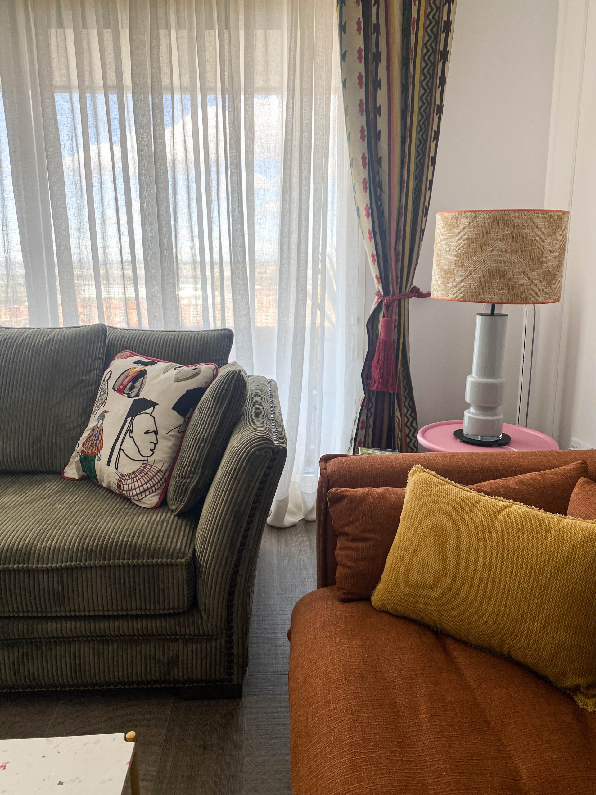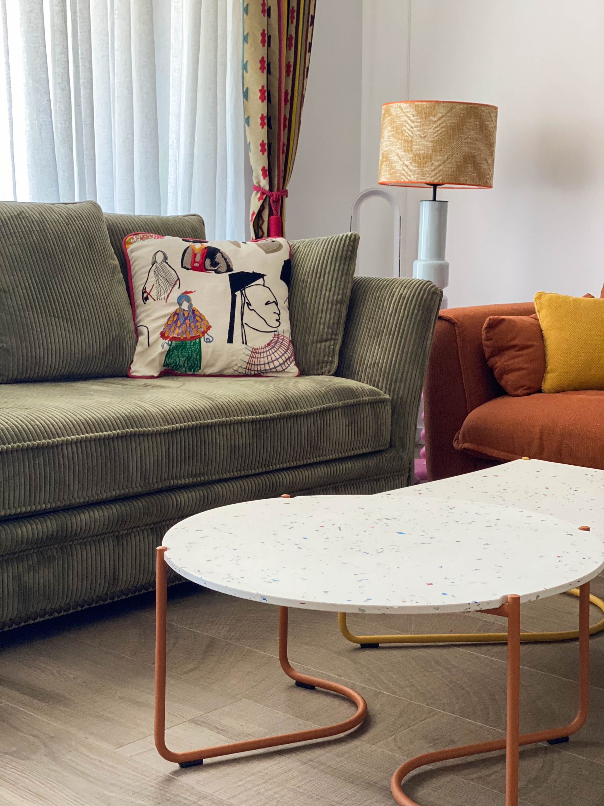 Como eje y protagonista principal está el revestimiento mural de @lamaisonpierrefrey. Donde a través de diferentes tejidos y papeles de la misma firma hemos conseguido el diseño de este espacio. Incluyendo molduras de ORAC DECOR , mesas de centro realizadas en PET imitación al terrazo realizadas por ONDARRETA un gran ventanal con un visillo custodiado dos grandes caídas de tejido bordado tambien de PIERRE FREY con borlones. Gran vitrina en hierro con cristaleras de DAREELS, luminaria de sobremesa en cerámica de AROMAS DEL CAMPO y tulipa a medida a conjunto con el papel. Los sofás, el sofá terracota ya estaba en la vivienda y nosotras propuesimos uno de de NOBLE CREACIONES en pana verde, que además de ser bonito y original se convierte en cama, le hemos aportado vida con diferentes con cojines personalizados, para la zona de comedor un banco a medida de tapicero en piel y boucle. Un salón al que no le falta detalle y que nos encanta.