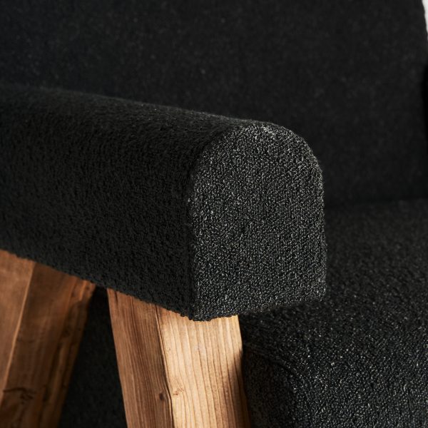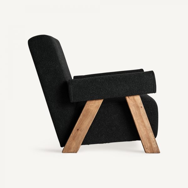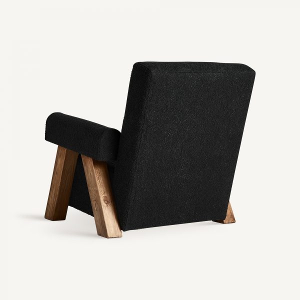 Sillón sully, en color negro/natural, de estilo art deco. Fabricado en madera de pino reciclado, combinado con poliéster.